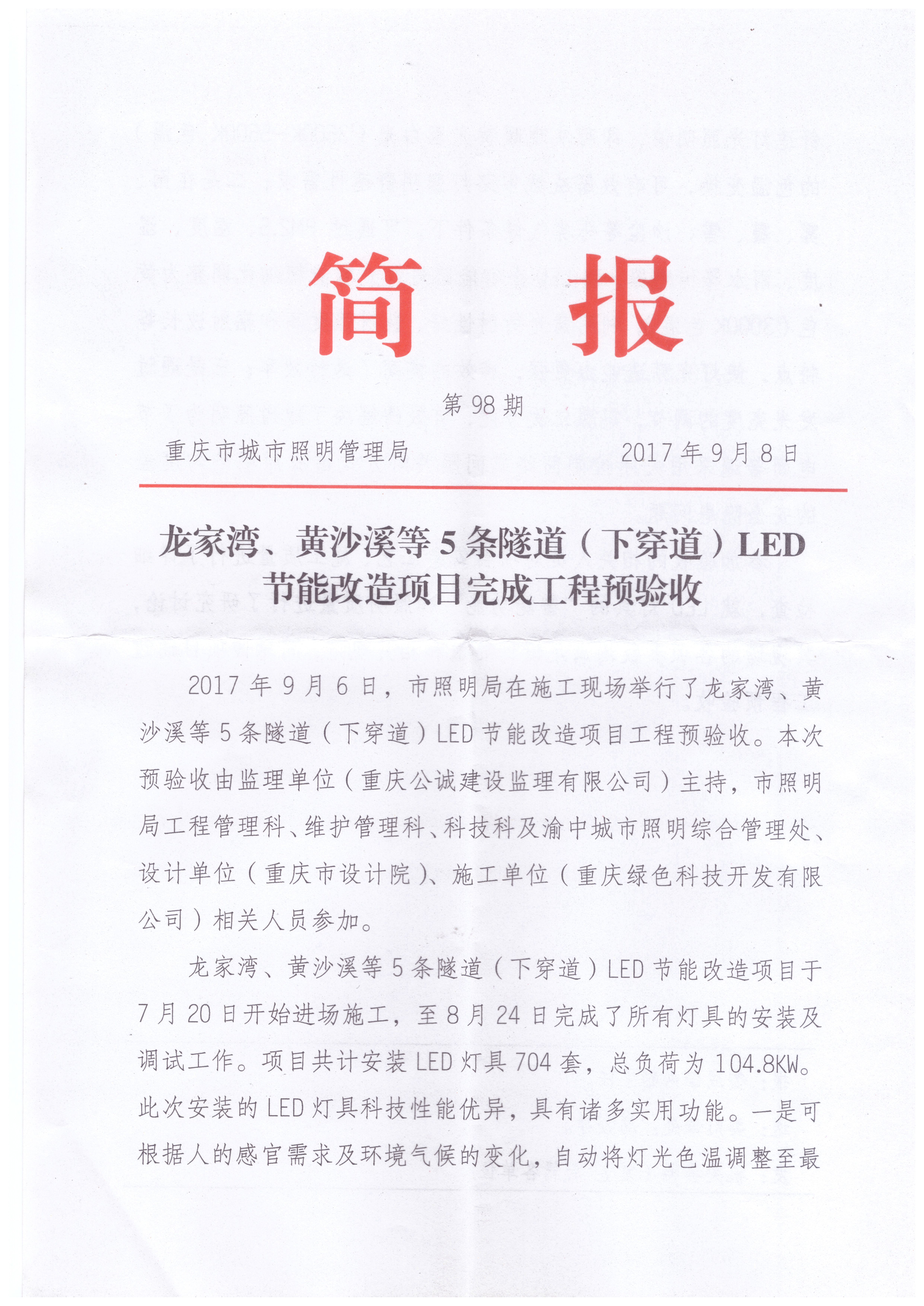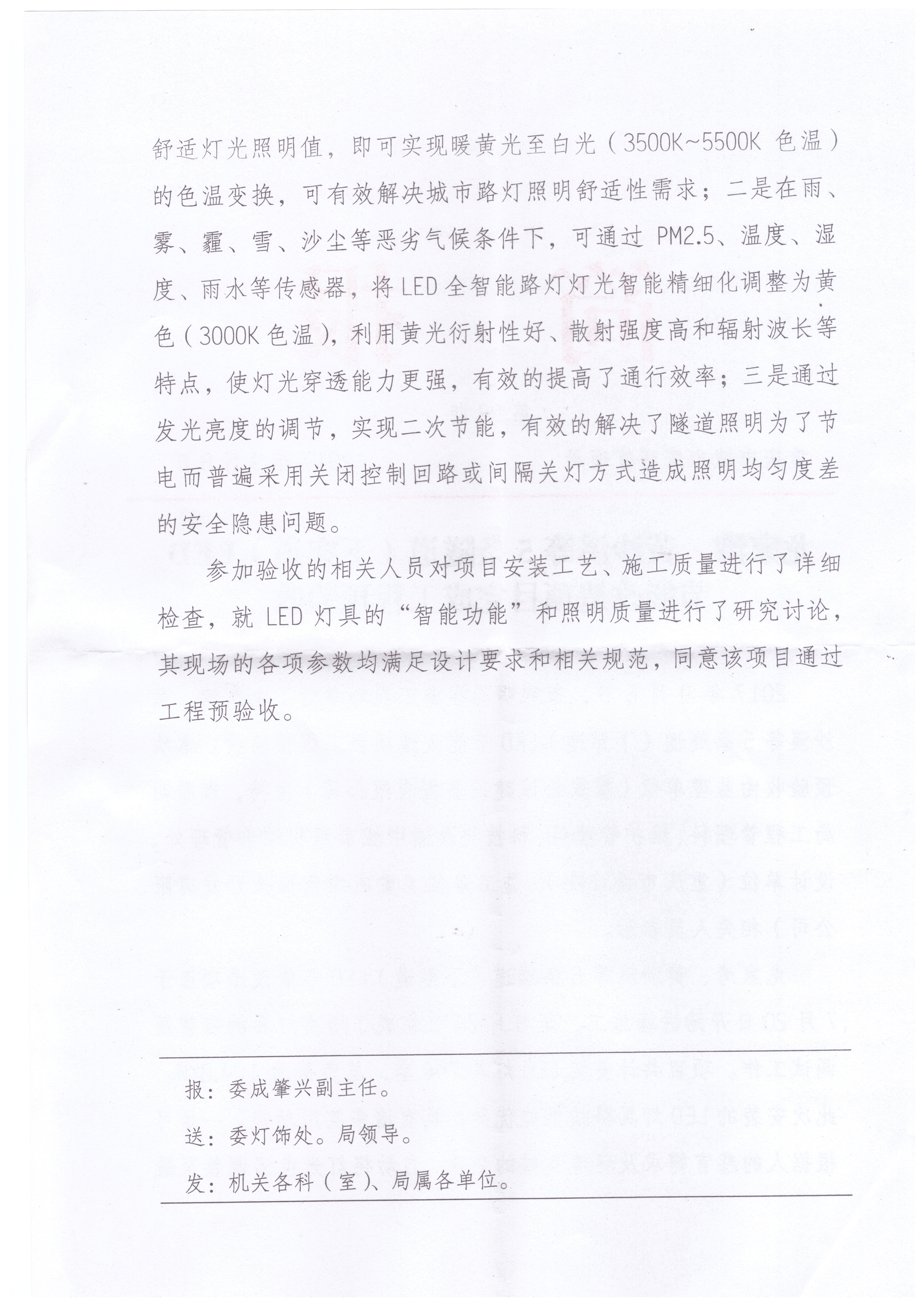 2017年7月31日,我司使用“中國創(chuàng)造”“互聯(lián)網(wǎng)+”多色溫防霧霾LED全智能路燈在重慶市龍家灣、黃沙溪、袁家崗、鵝嶺、陳家坪隧道實施科技節(jié)能改造工程已全面竣工。2017年9月6日,該項目建設單位重慶市城市照明管理局、監(jiān)理公司及設計公司對該項目進行了現(xiàn)場預驗收,參會人員對該創(chuàng)新專利產(chǎn)品作出了極高的評價。會后,重慶市城市照明管理局專門印發(fā)了《龍家灣、黃沙溪等5條隧道(下穿道)LED節(jié)能改造項目完成工程預驗收》簡報(附后),其上級主管部門重慶市城市管理委員會對其進行了新聞報道。