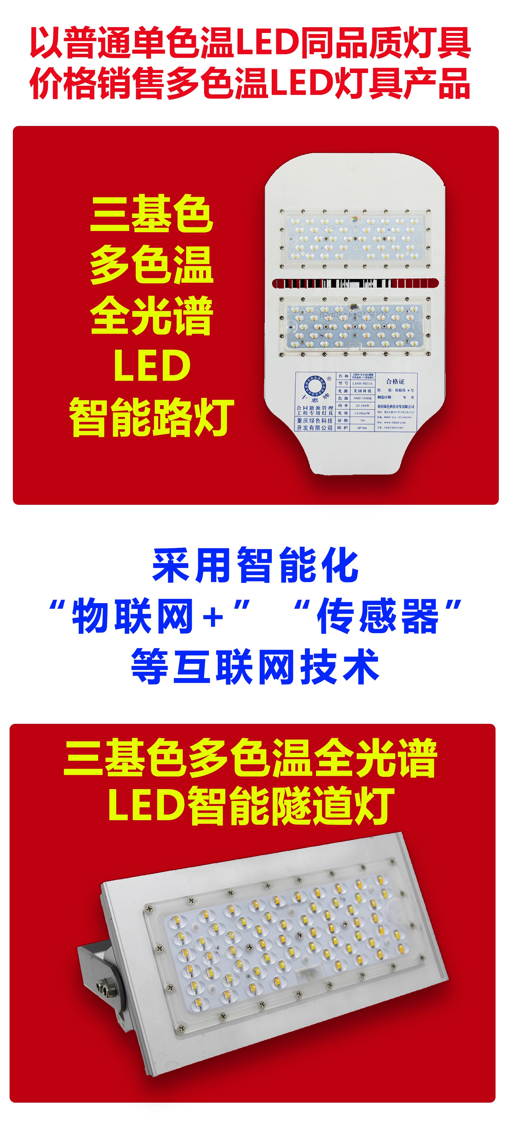 重慶“中國(guó)創(chuàng)造”三基色多色溫全光譜LED人工智能路燈技術(shù)是世界城市路燈照明領(lǐng)域淘汰普通單色溫LED路燈的先進(jìn)制造技術(shù),市場(chǎng)前景巨大。為了進(jìn)一步開(kāi)拓多色溫LED智能路燈照明市場(chǎng),重慶綠色科技開(kāi)發(fā)(集團(tuán))有限公司(以下簡(jiǎn)稱我司)擬尋覓誠(chéng)實(shí)守信、具有實(shí)力的LED電源制造公司、LED路燈燈具制造公司合作,整合資源優(yōu)勢(shì),免費(fèi)開(kāi)放多色溫全光譜LED智能路燈、智能終端控制器制造技術(shù),在合作期間免費(fèi)提供國(guó)家級(jí)“智慧城市”城市照明夜景燈飾四級(jí)考評(píng)管理共享平臺(tái)使用,通過(guò)技術(shù)共享,實(shí)現(xiàn)共同對(duì)外銷(xiāo)售,達(dá)到雙贏的目的,請(qǐng)有意合作者與我們聯(lián)系……